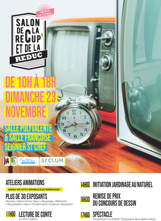 L’équipe du SYCLUM sera aussi mobilisée à l’occasion du salon de la Récup’ & de la Réduc à la salle polyvalente et salle Françoise Seigner à Saint-Chef, le Dimanche 23 novembre de 10h à 18h.