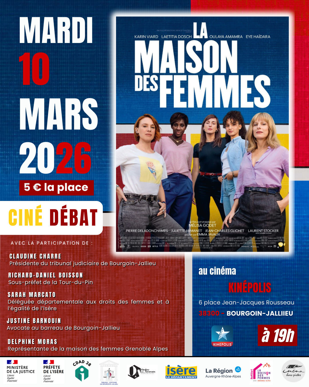 A l’occasion de la Journée des femmes (08 mars), le conseil départemental de l’accès au droit de l’Isère organise un ciné-débat autour du film « La Maison des Femmes » de Mélissa GODET, au cinéma Kinépolis de Bourgoin-Jallieu, le mardi 10 mars 2026 à 19h00.