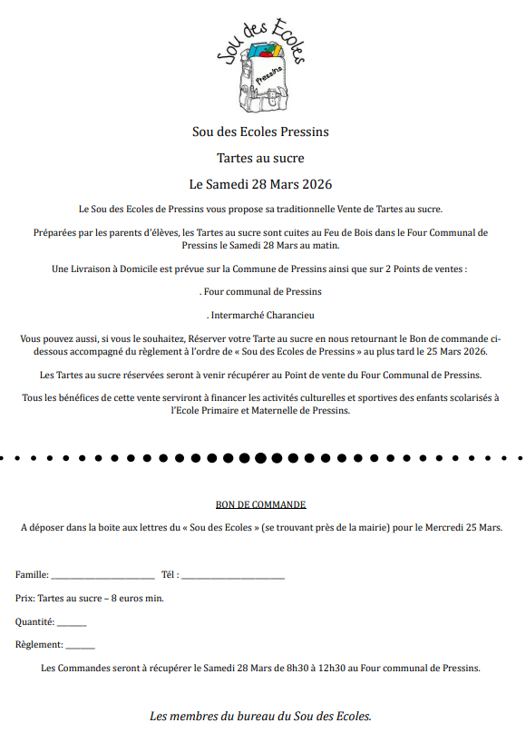 🤩 Le sou des écoles vend les traditionnelles tartes au sucre le samedi 28 Mars 2026 de 8h30 à 12h30 au four communal de Pressins. Pour les habitants de Pressins, une livraison à domicile est prévue.